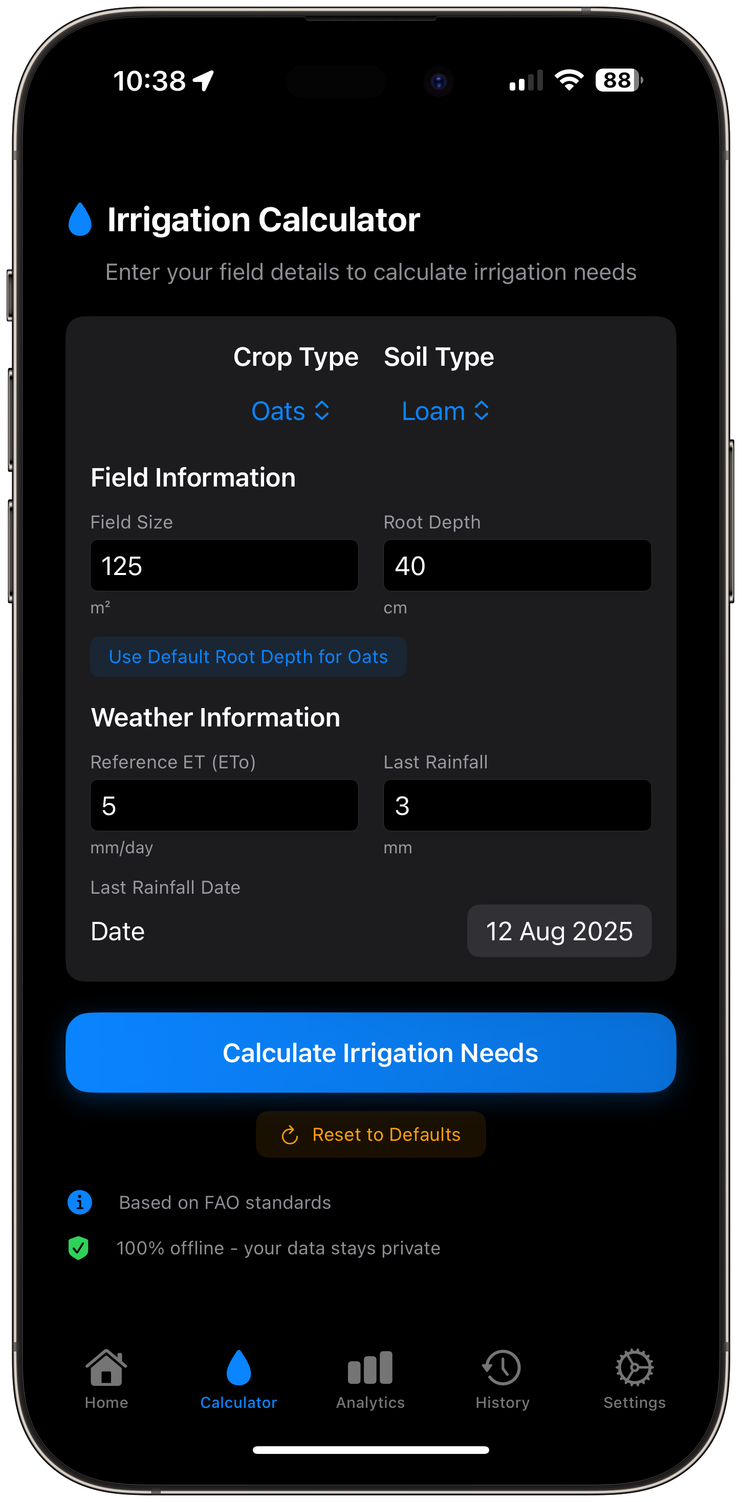 Instead of manual tracking, Irrigation Calculator Pro calculates your irrigation frequency instantly: