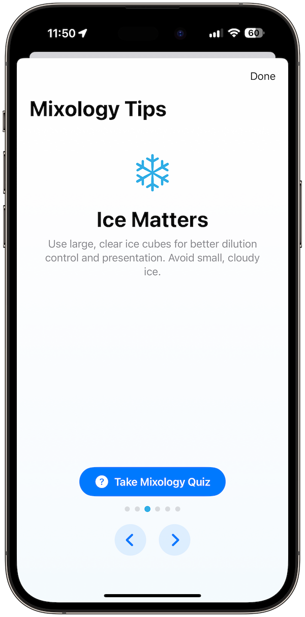 Mixology Learning Tools: Access expert tips, best practices, and a built-in cocktail quiz to test your knowledge.