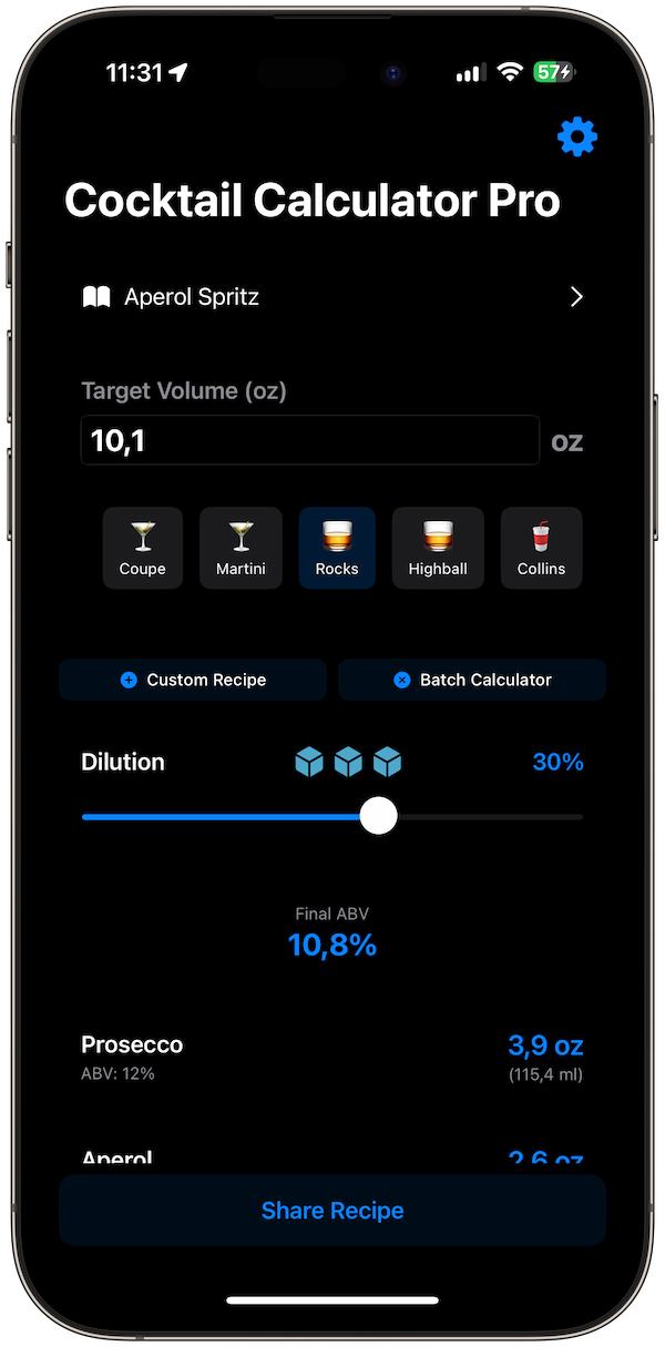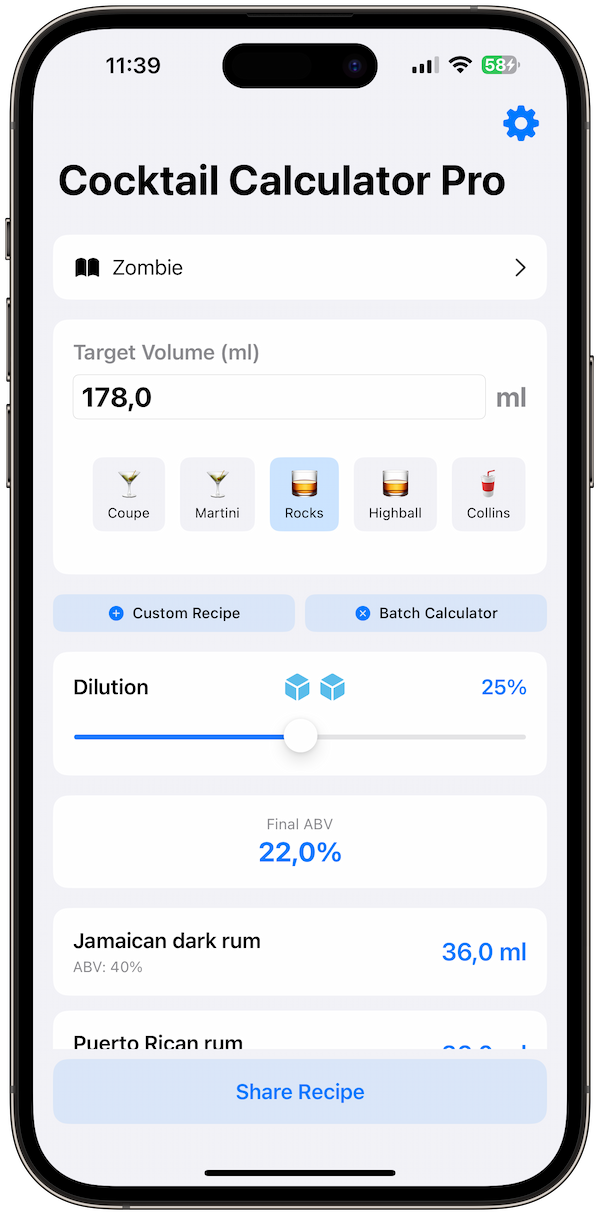 Glass Size Integration: Adjust recipes instantly for coupes, rocks, highballs, and more.