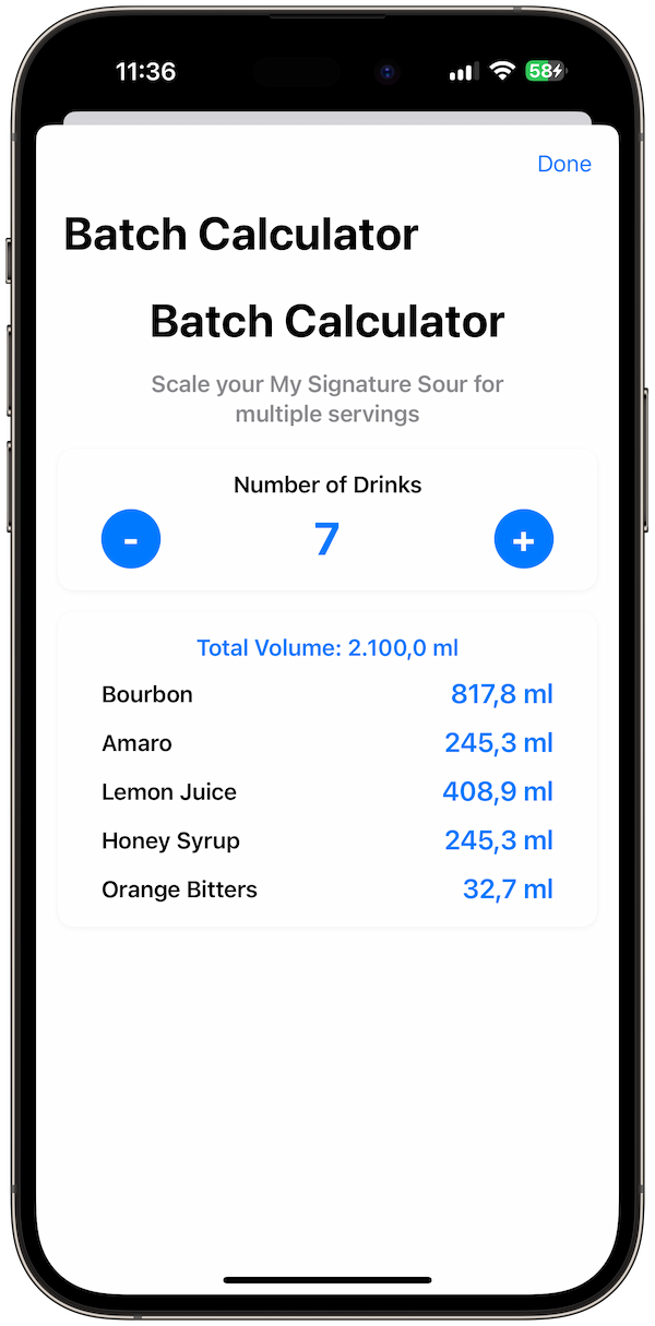 Batch Calculator: Plan cocktails for parties or events with proportional scaling for 5, 10, or 20+ servings.