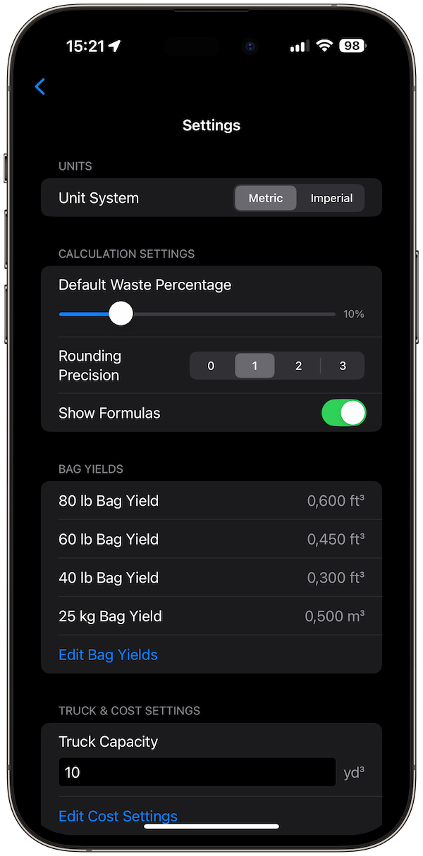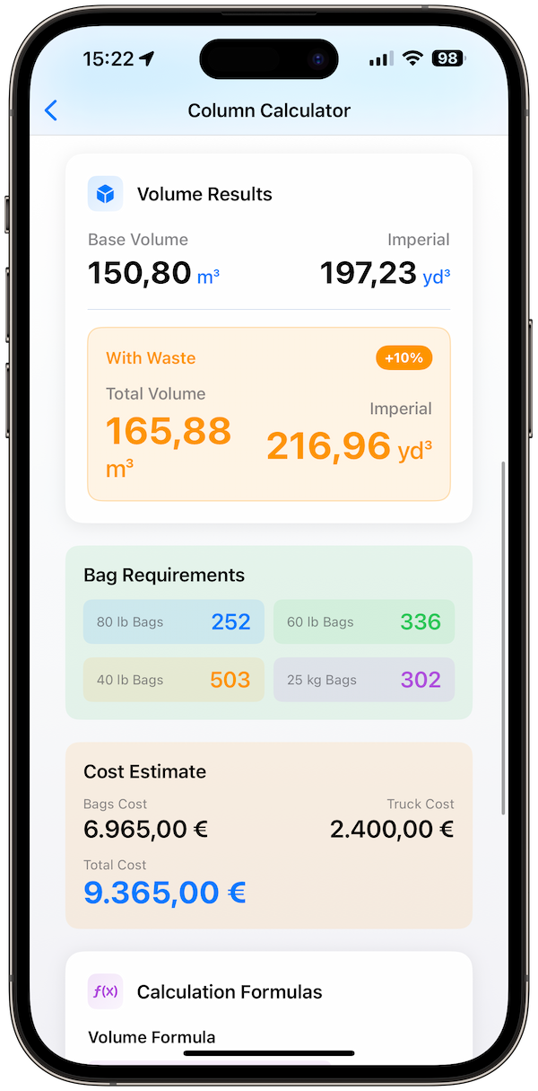 Next, the app converts those volumes into bag counts (80 lb, 60 lb, 40 lb, or 25 kg bags), with costs automatically updated based on your input pricing. You can also include truck delivery costs or yard/m³ pricing for larger jobs. Adjustable waste percentages let you plan realistically, avoiding costly underestimation.