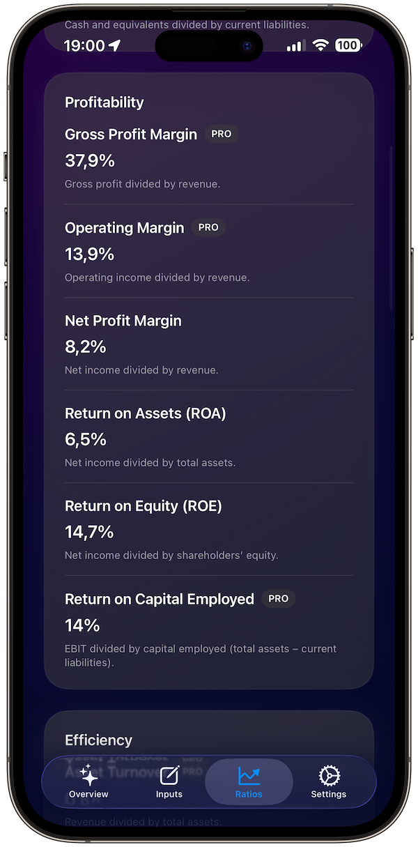 Instantly calculate liquidity, profitability, leverage, efficiency, and valuation ratios. All in one clean app.