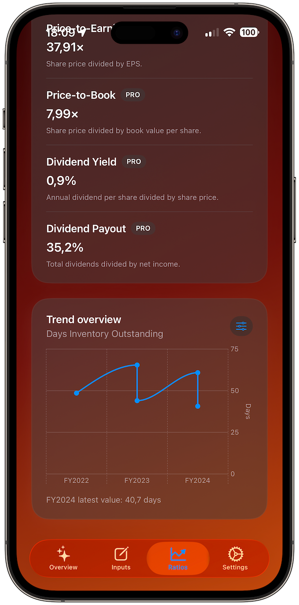 The app is free to download. Core ratios are free, while Pro unlocks 25+ advanced ratios, exports, and multi-year features.