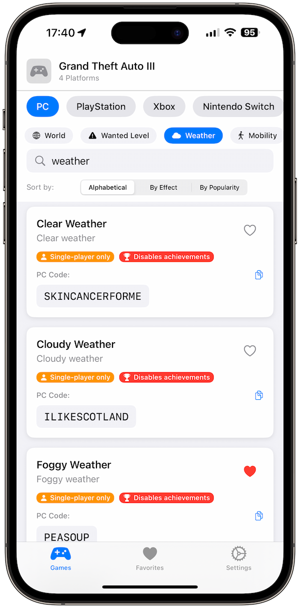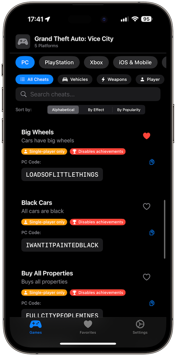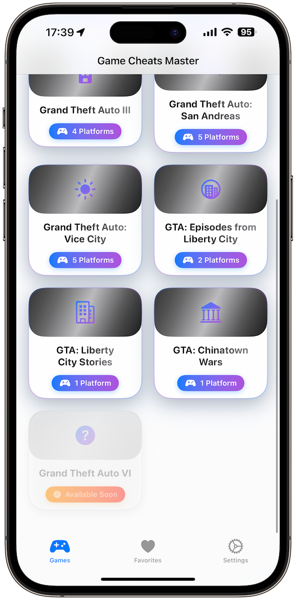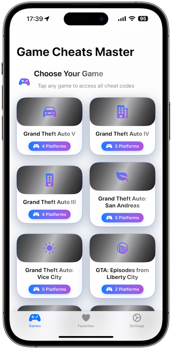 Master Cheats is your ultimate GTA companion app. Whether you’re causing chaos in Liberty City, cruising through Los Santos, or preparing for GTA VI, all cheat codes are just one tap away. The app includes cheats for every GTA title, all major platforms, and a favorites system to keep your go-to codes handy. Unlike messy web lists or ad-filled apps, Master Cheats is fast, modern, and 100% offline.
