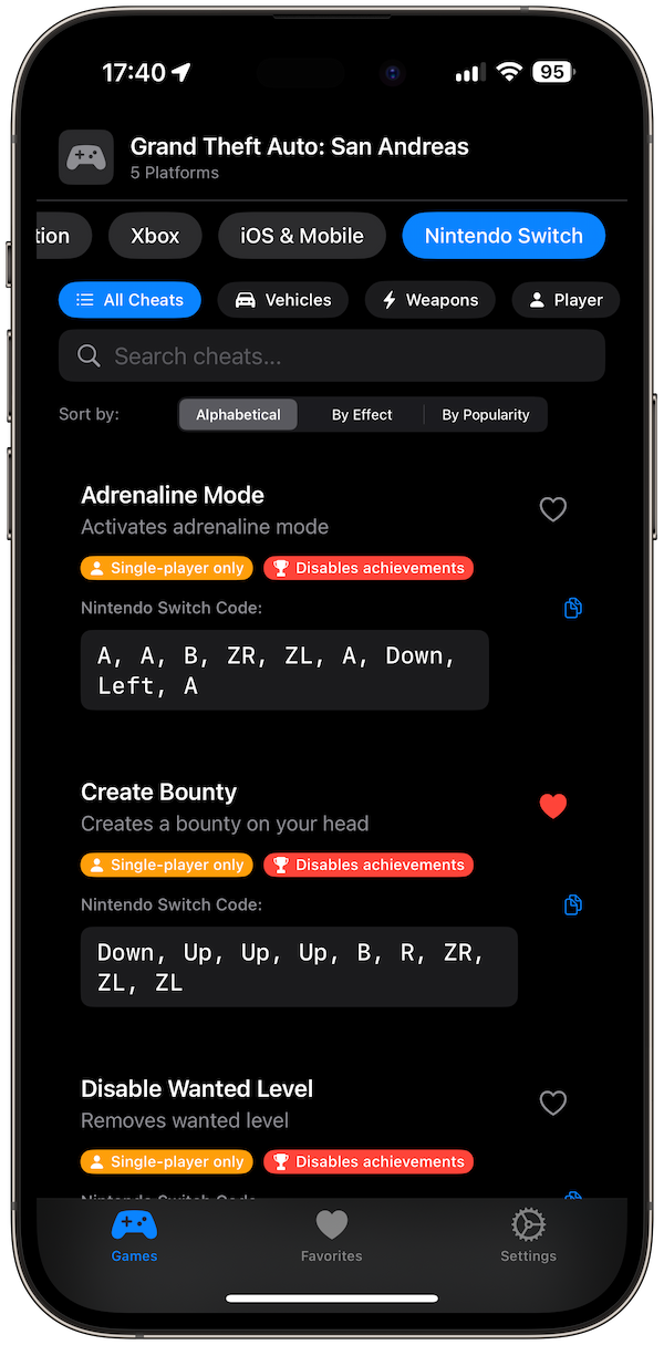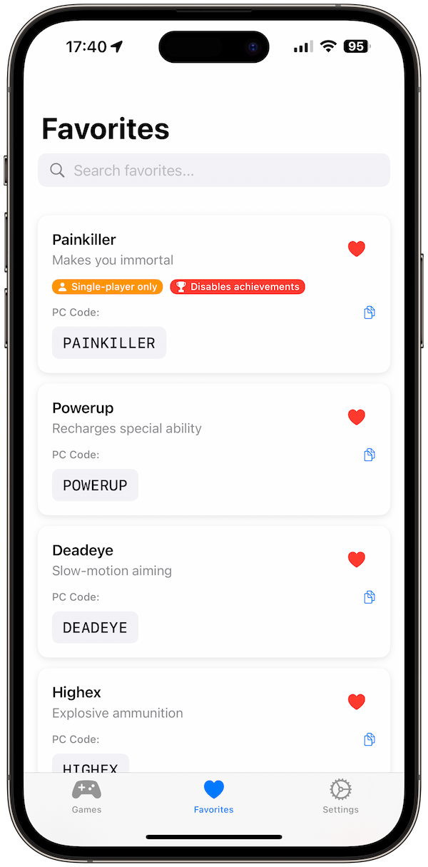 Yes. Tap the heart to save any cheat to Favorites for fast access.