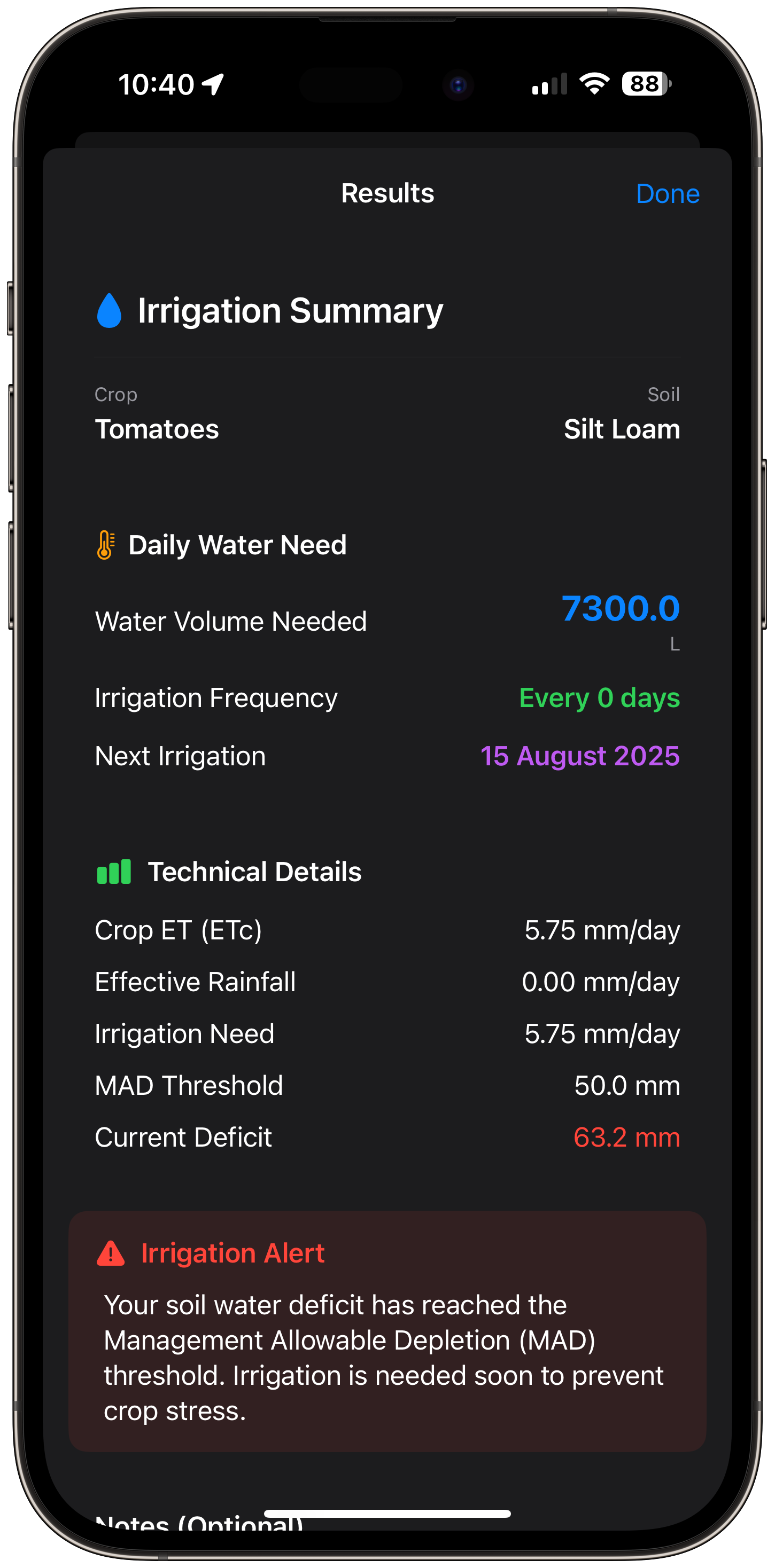Traditionally, calculating irrigation means juggling all these variables manually or in spreadsheets. With Irrigation Calculator Pro, the process is reduced to just a few taps: select your crop and soil type, enter your field and weather data, and the app instantly delivers how much water to apply and when. Behind the scenes, it runs the FAO-56 equations and alerts you when soil moisture approaches the MAD threshold, ensuring your crops get exactly what they need without waste.