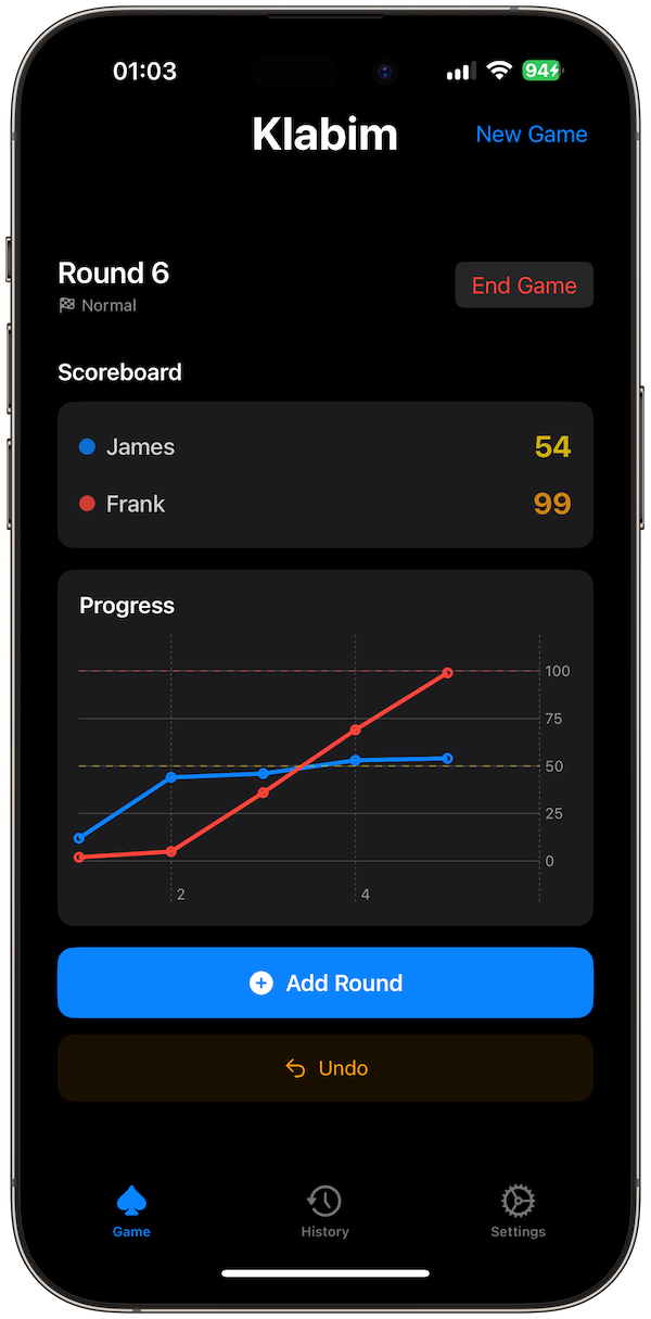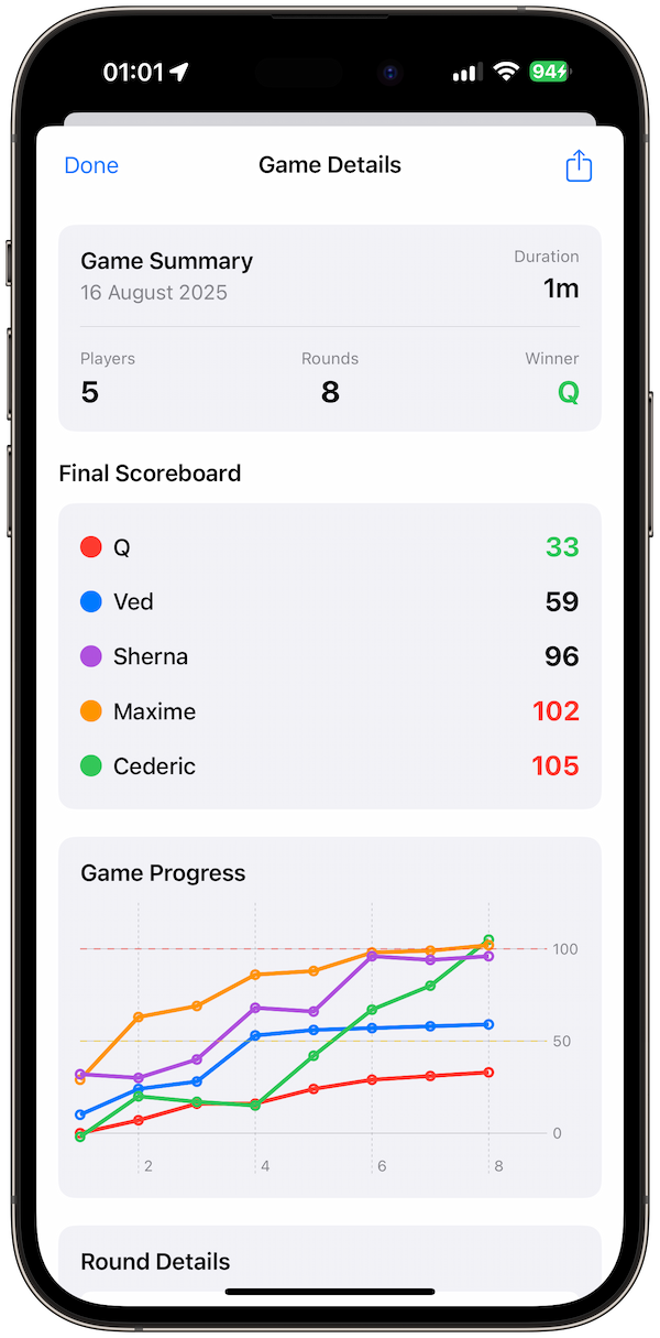 When the game ends, Klabim saves the complete history locally, including final scores, round details, and progress charts. You can review past games anytime, track who’s winning most often, and even share results with friends via AirDrop, Messages, or social media.