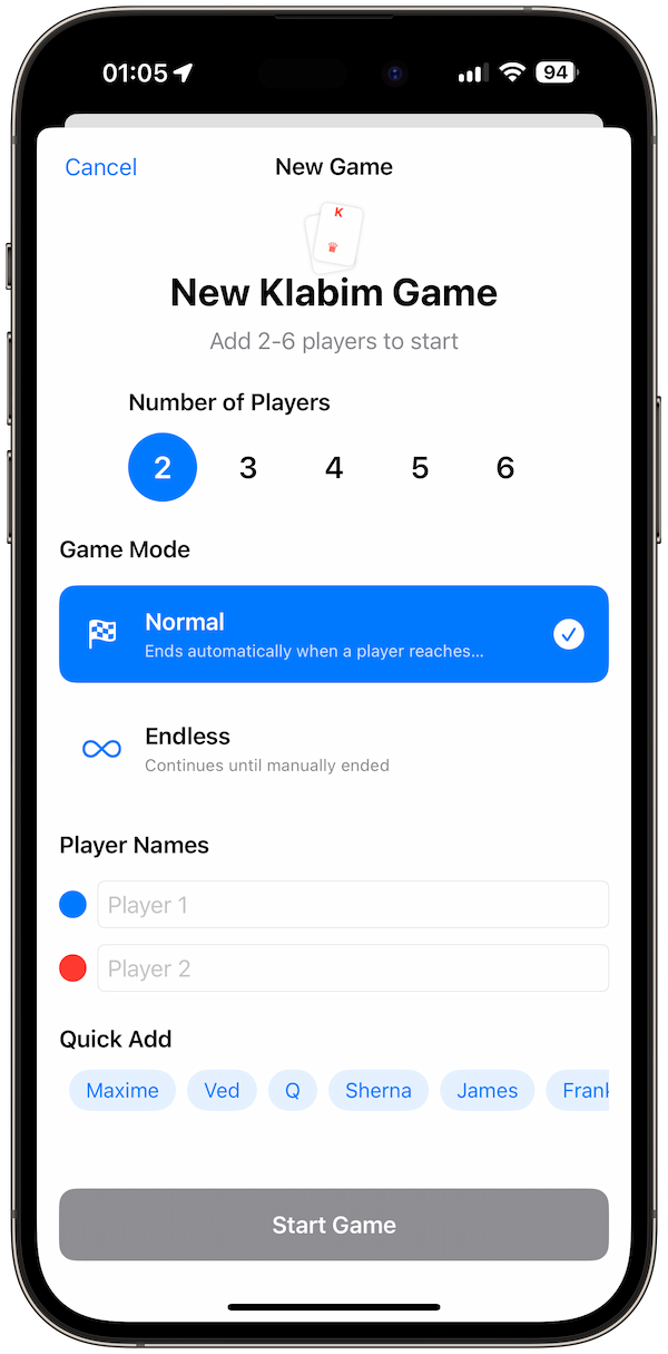 Klabim Scorekeeper makes your card game nights smoother by handling every rule and score for you. Start by creating a new game session and adding 2–6 players. You can even save frequent player names for quick setup. After each round, simply enter the points for every player, and the app instantly applies Klabim’s rules. This includes automatic -25 when a player hits exactly 50 or 100 points, and +25 when someone wrongly calls “Klabim.”