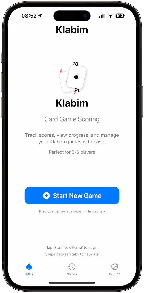 Klabim Scorekeeper handles all the rules, scoring, and stats automatically. No more messy paper score sheets.