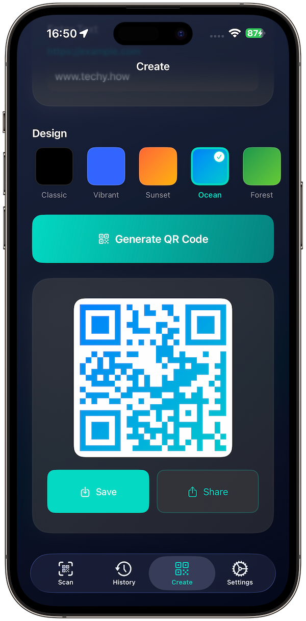 Create: Pick Text/URL, choose a style, then Generate and export as PNG/PDF. Apps