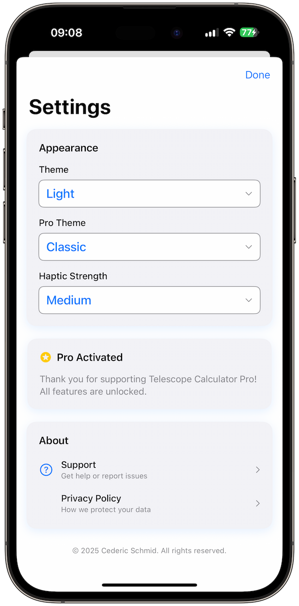 For even more flexibility, upgrade to Pro: save unlimited equipment cases, compare two eyepieces side-by-side, unlock precision TFOV with field-stop calculations and apply Quick Sets with one tap. Everything works offline, with no accounts or tracking, just smooth astronomy calculations at your fingertips.