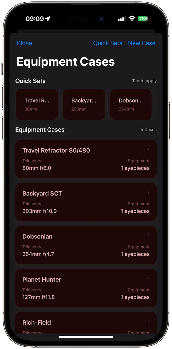 They let you save telescopes and eyepieces for quick access. Free users get one default case, while Pro users can save unlimited setups.