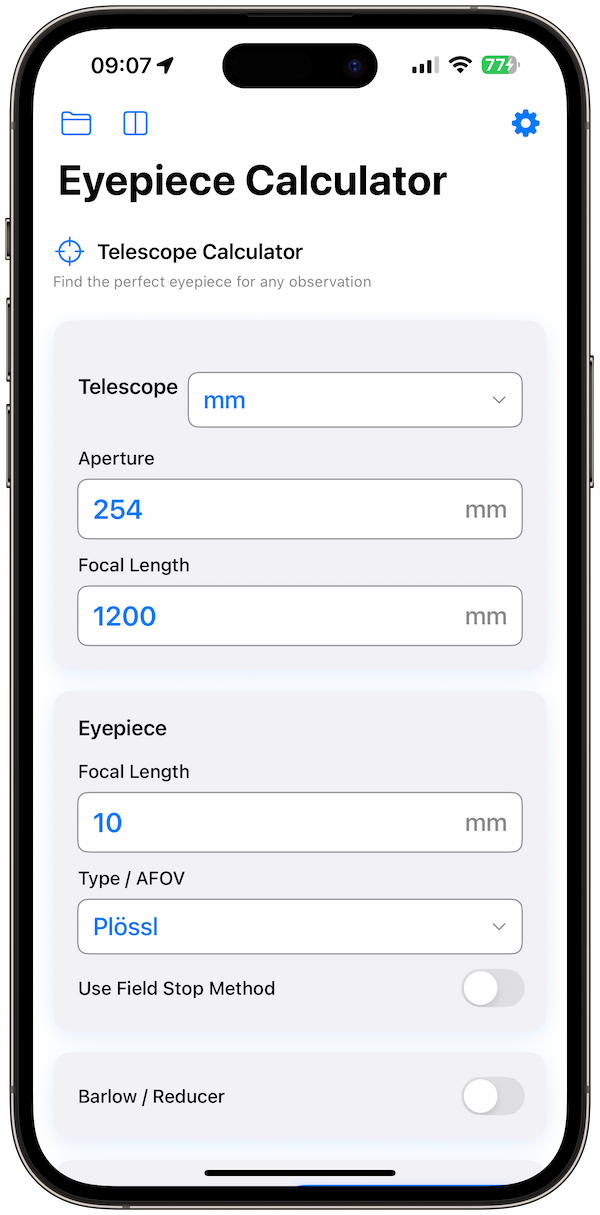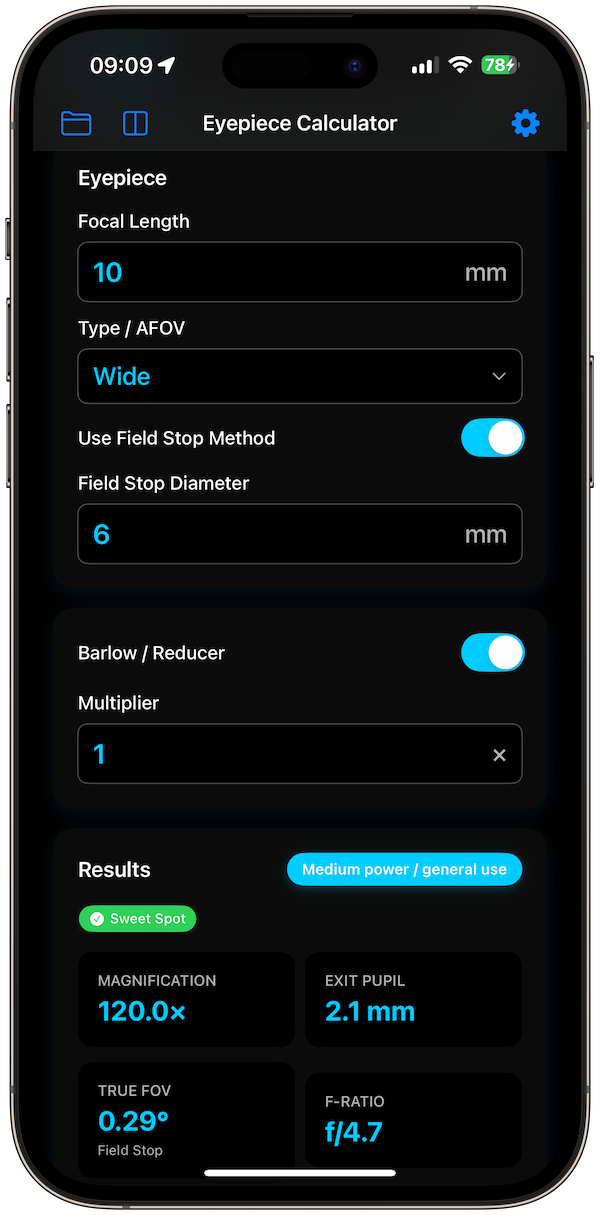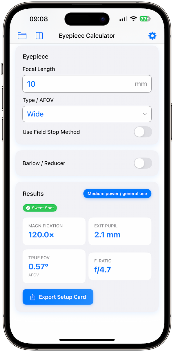 A free astronomy app that helps you choose the perfect eyepiece by calculating magnification, exit pupil, TFOV, and f-ratio in real time.
