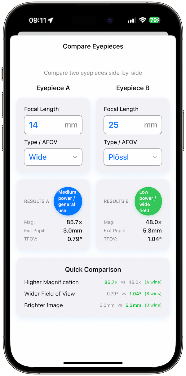 Eyepiece Compare: Evaluate two eyepieces side-by-side for smarter choices.