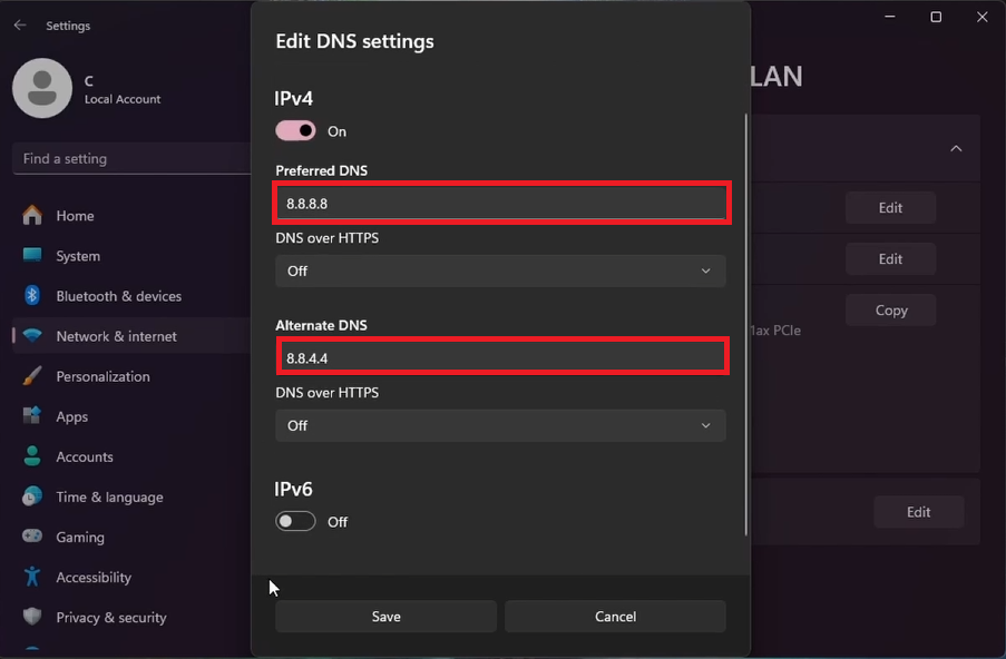 Edit "DNS server assignment" to Manual and enable IPv4.