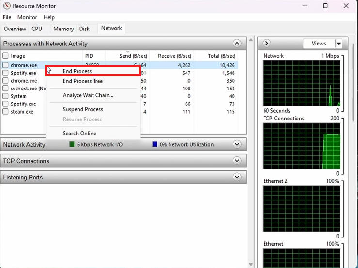 Focus on the "Network" tab and end tasks that are consuming bandwidth.