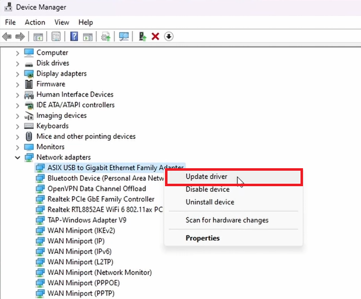 Expand "Network Adapters," right-click your active adapter, and select "Update Driver."
