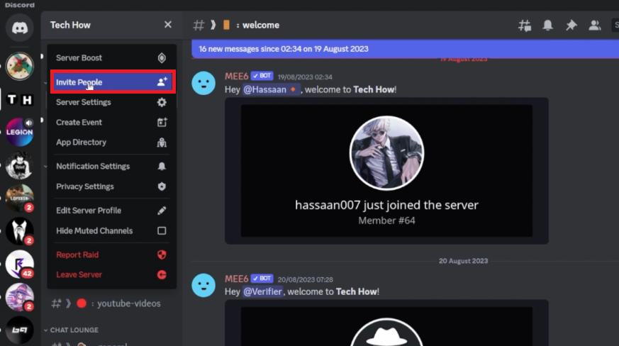Access Invite Options: Click on the server name to bring down a menu, where you will select the "Invite People" option.