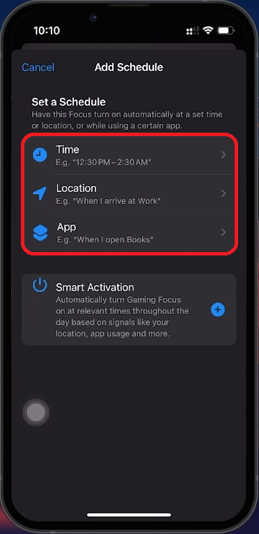 Scheduling: Set Focus to activate automatically based on time, location, or app usage.