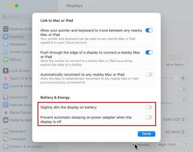 After looking at your Lock Screen settings, navigate to the Displays section of your settings. Scroll down and click on Advanced. Under Battery & Energy, you can toggle this option on and off, which will dim your display after some time of inactivity while on battery. Below, you can turn this option on to prevent your Mac from sleeping when it's plugged into a power source.