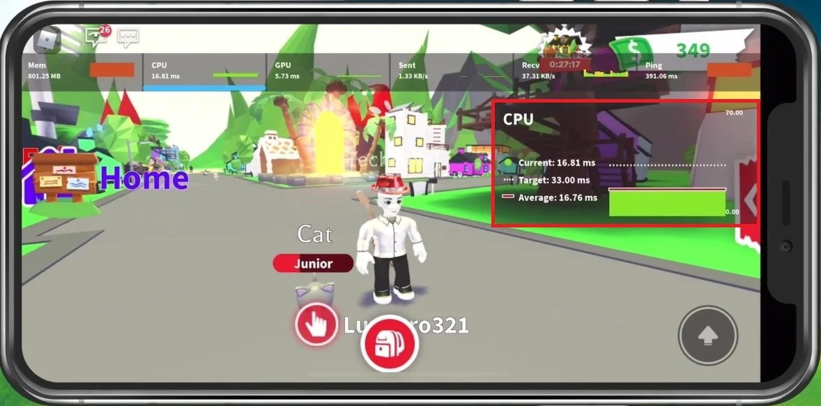 You should also enable the Performance Stats setting to see your memory, CPU, GPU, and network usage while playing Roblox on your mobile device.