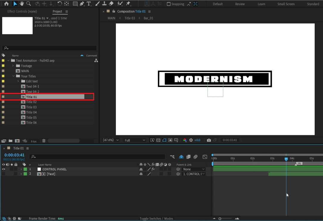 Within this folder, find and double-click on the 'Title_1' composition. This area is where you'll create your animation.