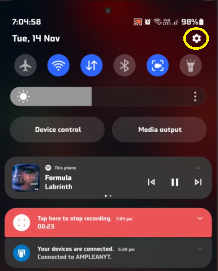 Tap the gear or wheel icon, usually found in the top-right corner of the notification panel.