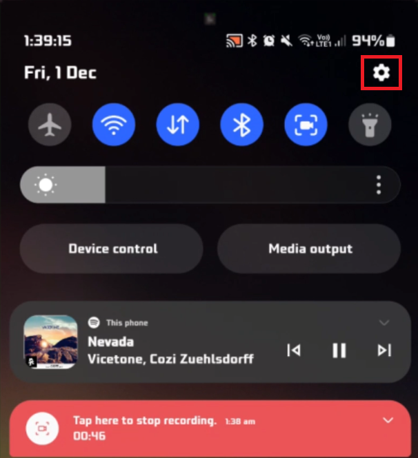 Open Device Settings: Swipe down from the top of your screen to reveal the notification panel, then tap the gear icon.