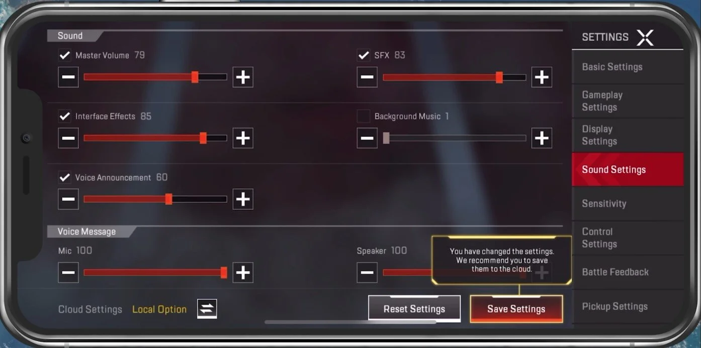When this is done, we will look at your Sound Settings. These will, again, depend on what you prefer. I like to reduce the Background Music by a lot. The Voice Announcement is also less important to me, especially when talking to teammates. The Voice Message Mic volume should not be muted to use voice chat in-game properly.