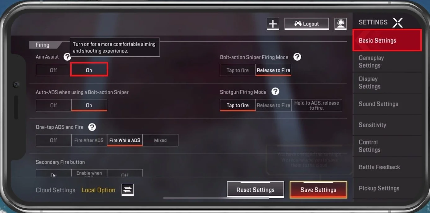 In the Basic Settings tab, you can enable or disable Aim-Assist. Enable Aim-Assist when playing for the first time, as it will greatly help you track enemy movement. Having more than one enemy in your sights can mess up your aim, but I would still leave this option enabled. Change the fire modes to your liking. Many of these settings will come down to personal preference, and you should edit them while playing a game to see what works best for you.