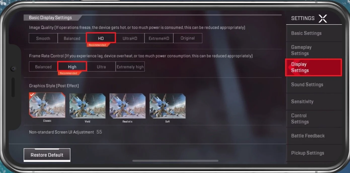 Set the Frame Rate Control option to High when using a newer mobile device that supports higher frame rates. Otherwise, set this to Balanced as well. You can also reduce the battery consumption of the game when reducing the FPS control option. The Graphics Style option should not impact your performance a lot. It will rather change the colors and contrast you see while playing Apex Legends.
