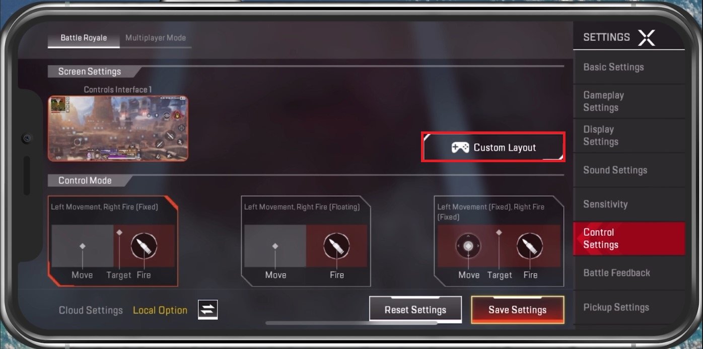 Your Control settings allow you to change your Screen Settings and Control Modes for the Battle Royale and Multiplayer Mode individually.