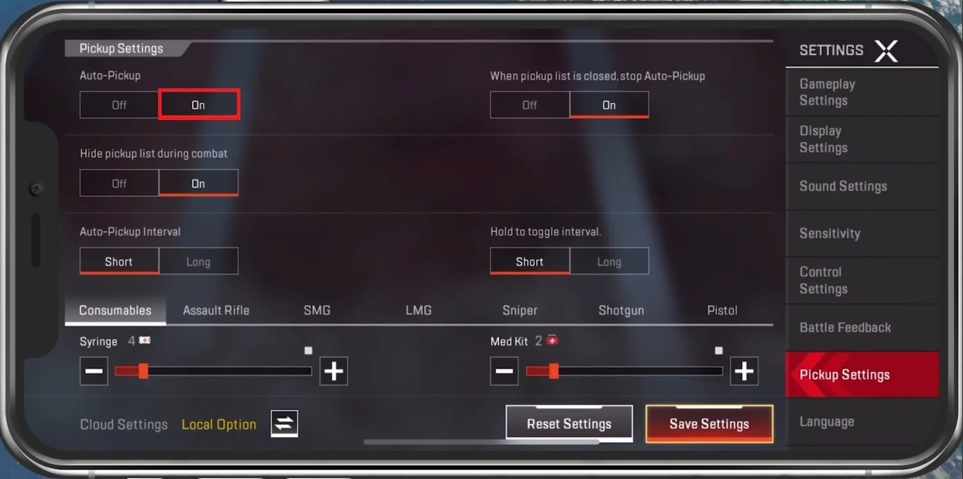 After taking a look at these settings, tap on Pickup Settings. These settings will automatically determine what the game picks up when playing battle royale or multiplayer. I would suggest leaving the Auto-Pickup option enabled. You can then change the amount of Consumables, and weapon ammunition the game should pick up automatically.