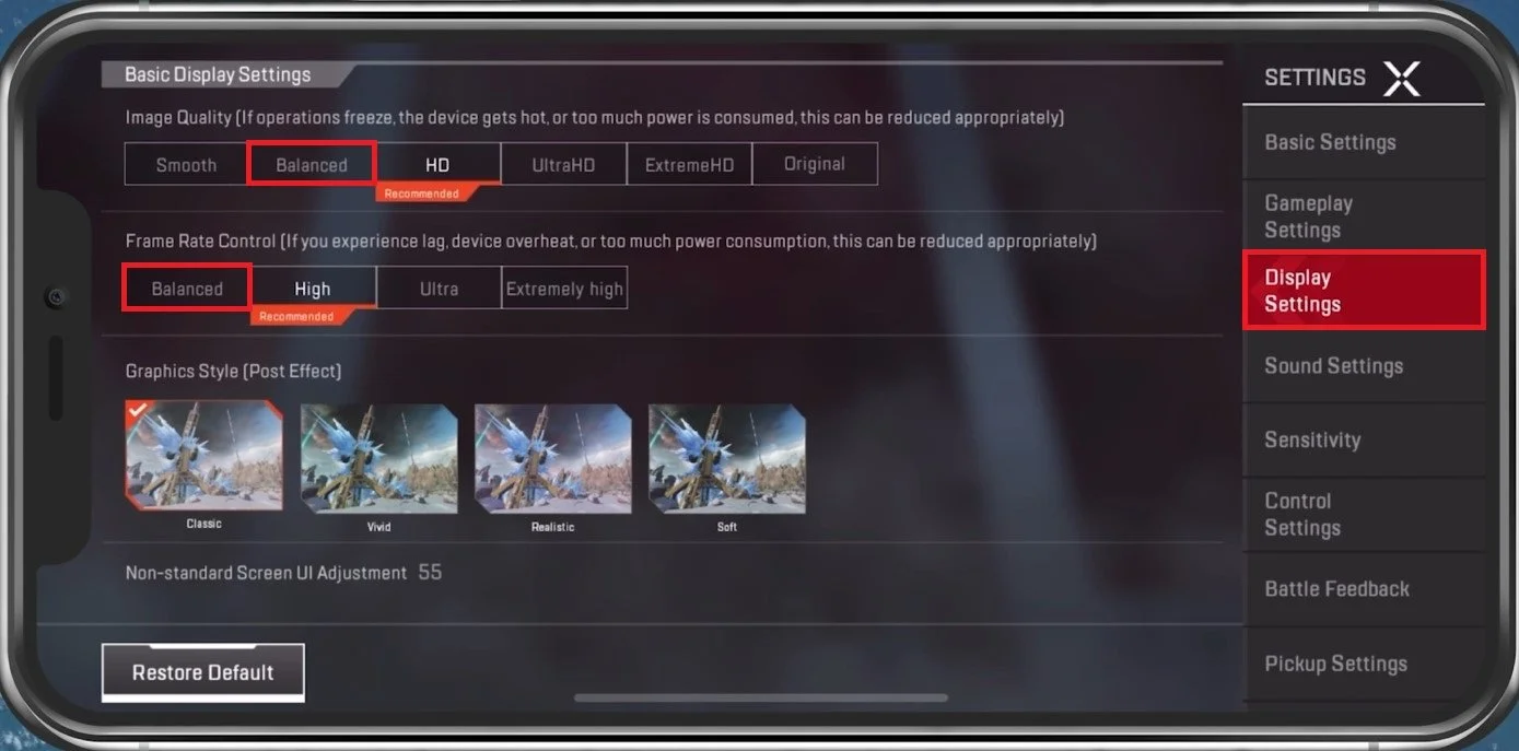 Launch Apex Legends and navigate to your Settings. Your Display Settings will have a lot of impact on your gameplay's performance and visual quality, and they will heavily depend on your device’s performance and your quality/performance preferences. For reference, I am using an iPhone 11 Pro max in this example, and the game runs very well with enough quality for the screen size.