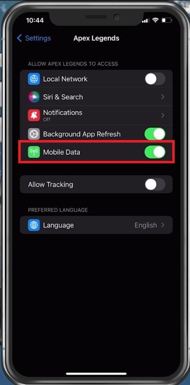 Scroll down to your Apex Legends settings and ensure the Mobile Data option is enabled.