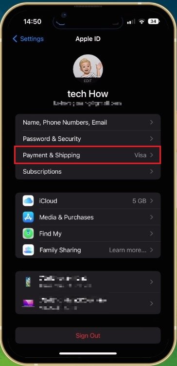 Next, open up your system settings. Tap on your Apple ID name, and from here, select Payment & Shipping. You might be required to log in with your Apple ID account before making any changes to these settings.