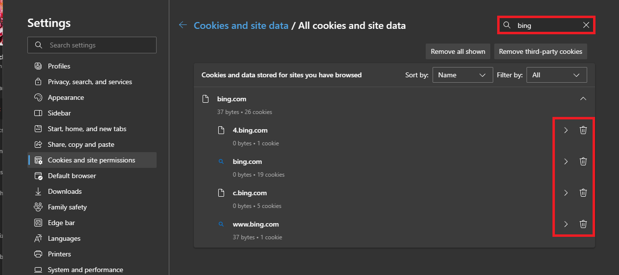 Clear your browser cache and site data for Bing.com to ensure that any account updates will show up when using Bing Chat. Using the Edge browser, click on the burger menu icon on the top right to access your browser settings. Navigate to Cookies and Site Permissions > Manage and delete cookies and site data > See all cookies and site data. Search for bing.com and clear all site cookies and data for the bing.com domain.