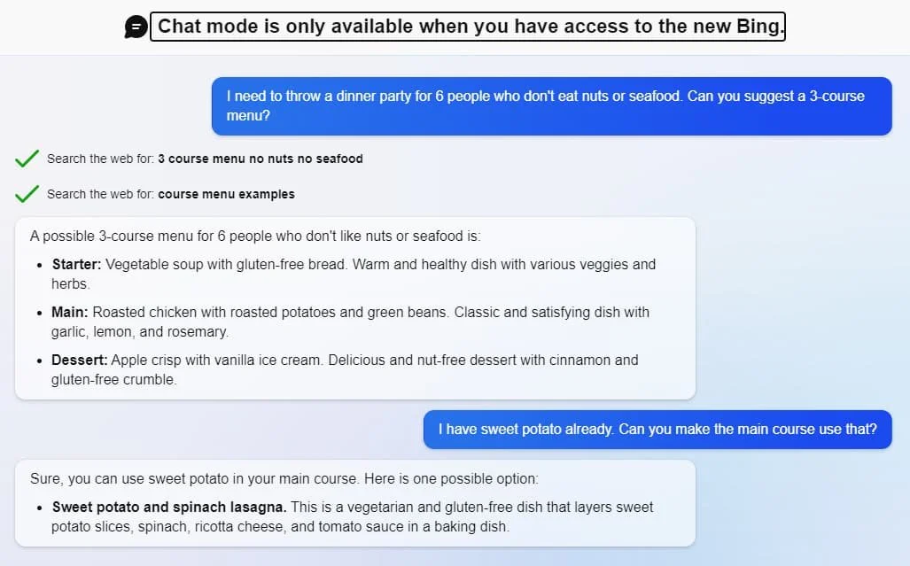 Users might see this “Chat mode is only available when you have access to the new bing” window. If this is the case for you, then join the waitlist, and you will receive an email in the coming hours or days that you have access to Bing Chat. You may only be asked to open Bing Chat using the Microsoft Edge browser. Make sure that the correct email address is associated with your account.