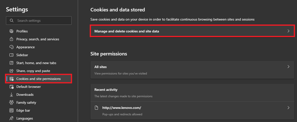 Delete bing.com site data and cookies
