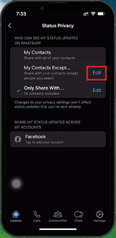Status Privacy Settings > My Contacts Except…