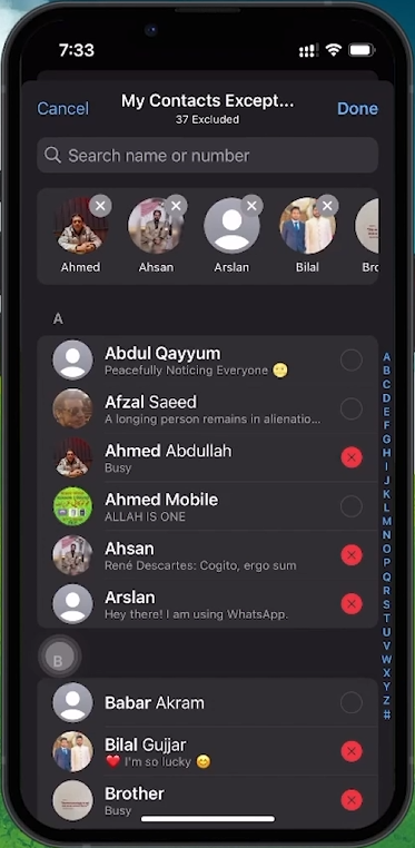 Scroll through the list and select the contacts you want to exclude from viewing your status.