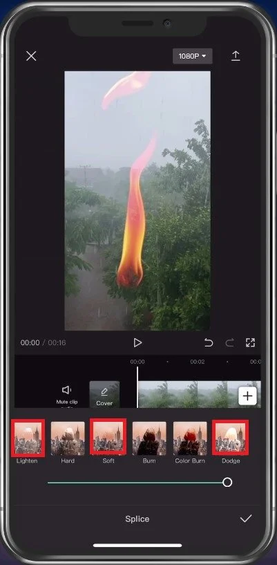 Next, tap on the Splice option in your toolbar. Depending on the base color of your overlay, you will have to use different options, such as Lighten, Soft, or Dodge. Using a black background, I will proceed with the Lighten option. The slider below will allow you to adjust the opacity, which should be set to around 70, but feel free to reduce it even more if it looks better with your footage.
