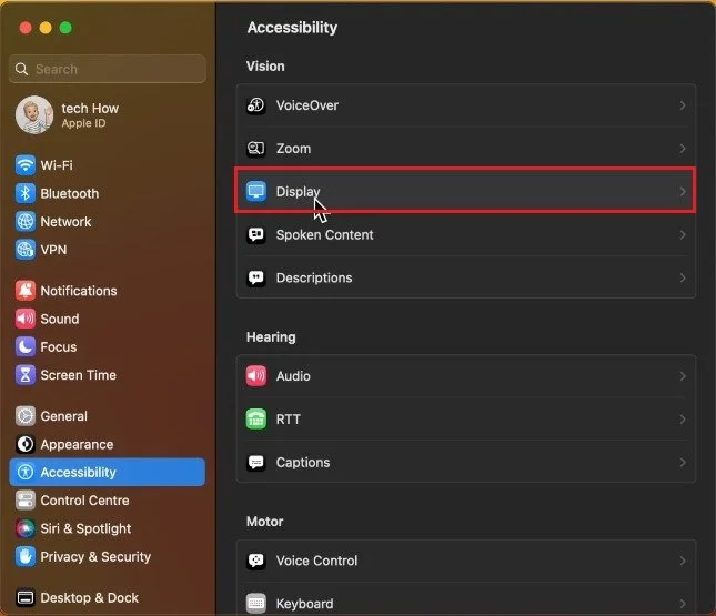 While using your Mac, click on the Apple icon on the top left of your screen and select System Settings. For macOS Ventura users and later, navigate to the Accessibility section and select Display.