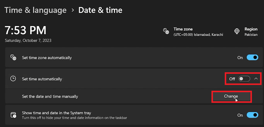 Once the automatic setting is disabled, click on Change under "Set the date and time manually."