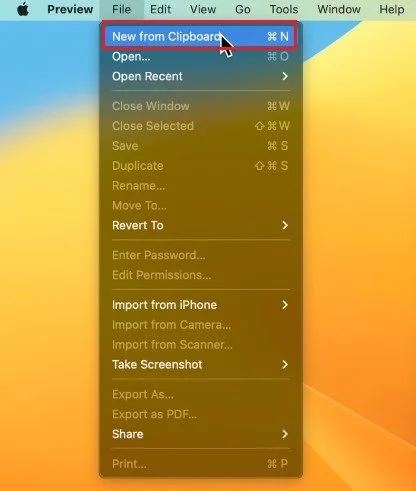 Having the folder icon copied to your clipboard opens up your preview application. Simply search for Preview in your spotlight search to open it up. Now that your preview app is open navigate to File > New from Clipboard.