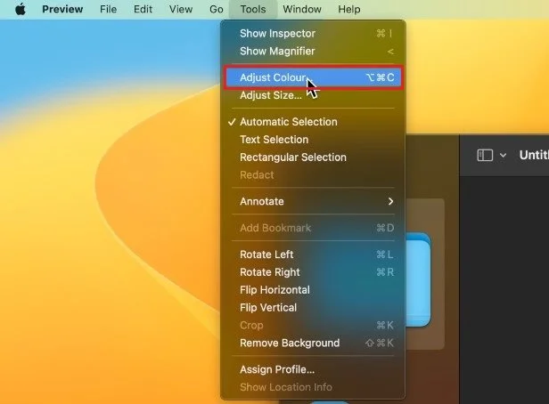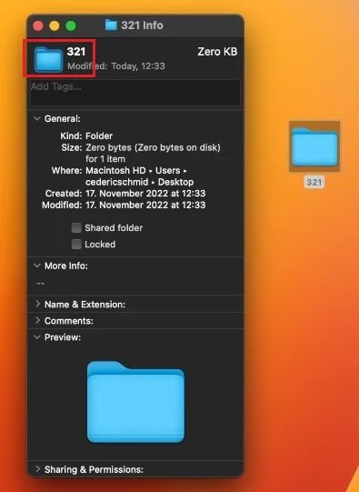 When you’re done editing and adjusting the color of this image, select the folder icon on the left side and copy it using the shortcut or navigate to Edit > Copy. You can close the Preview application and head to your folder’s information tab.