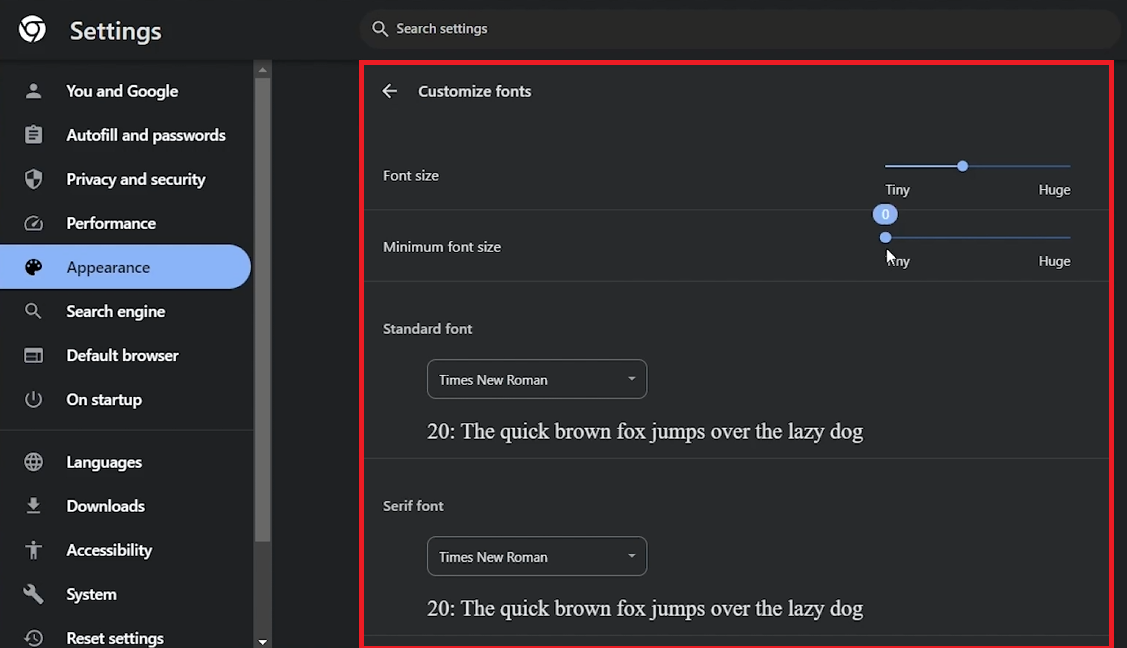 Adjusting the font size under 'Customize Fonts' changes it across all web pages, but preset font styles only affect certain areas of Chrome.