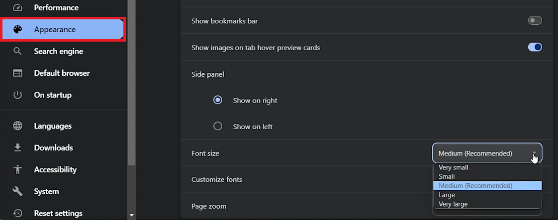 Choose from preset options like Very small, Small, Medium, Large, or Very large.