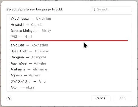 In this window, you can select one or more languages to add. All languages above this line are languages that are fully supported by the operating system and will show up in applications, messages, and menus. All languages below the line are not fully supported, but they may be used where they are available.