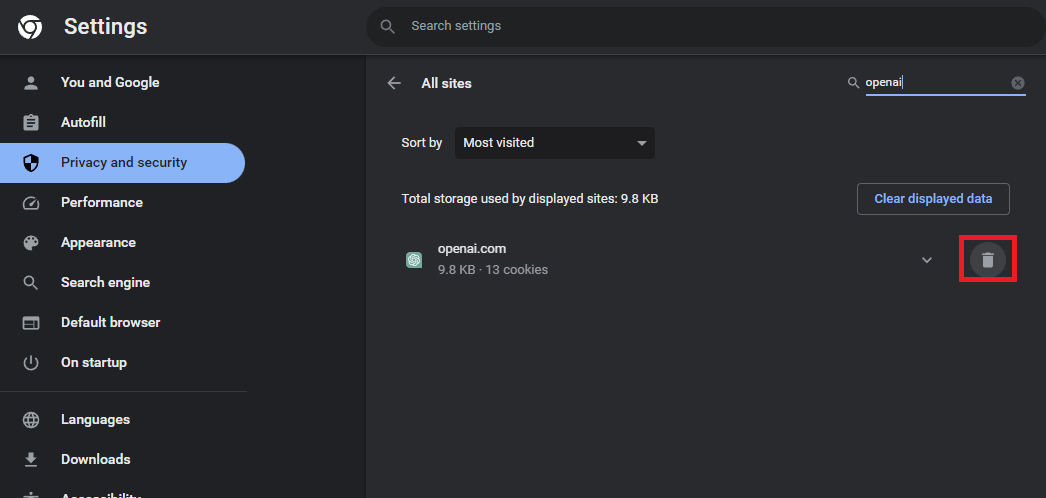 Another effective strategy for resolving the "Sorry, you have been blocked" error on ChatGPT involves clearing the OpenAI site data stored in your browser. For this example, we'll use Google Chrome: